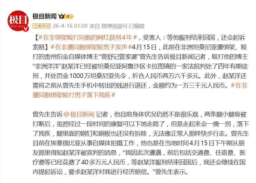 然而,对受害者曾先生而言,身体的创伤与生活的颠覆远未结束。他目前的身体状况依然不容乐观——当初被打断的两条小腿骨虽经治疗康复,但已落下残疾,走路一瘸一拐,腿内的钢钉和钢板尚未拆除,无法像正常人一样快步行走。如今在埃塞俄比亚继续从事自媒体工作的他,仅在4月15日才从朋友处得知赵某洋宣判的消息。